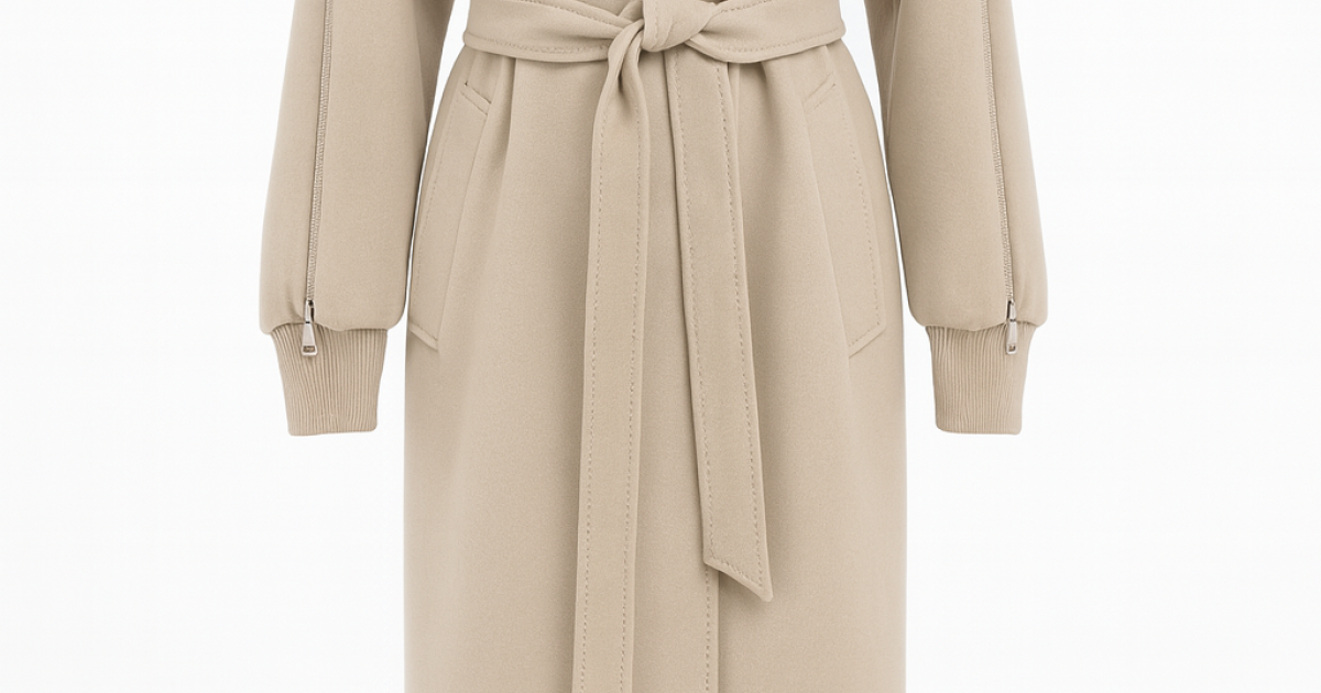 Dámský kabát s páskem v sadě. Model v maximální délce s podšívkou bez zateplení. Zapíná se na skrytý druk. Má boční rozparky s kapsami a dekorativní zipy na rukávech (nefunkční). Na konci rukávů jsou pletené manžety, vzadu rozparek.