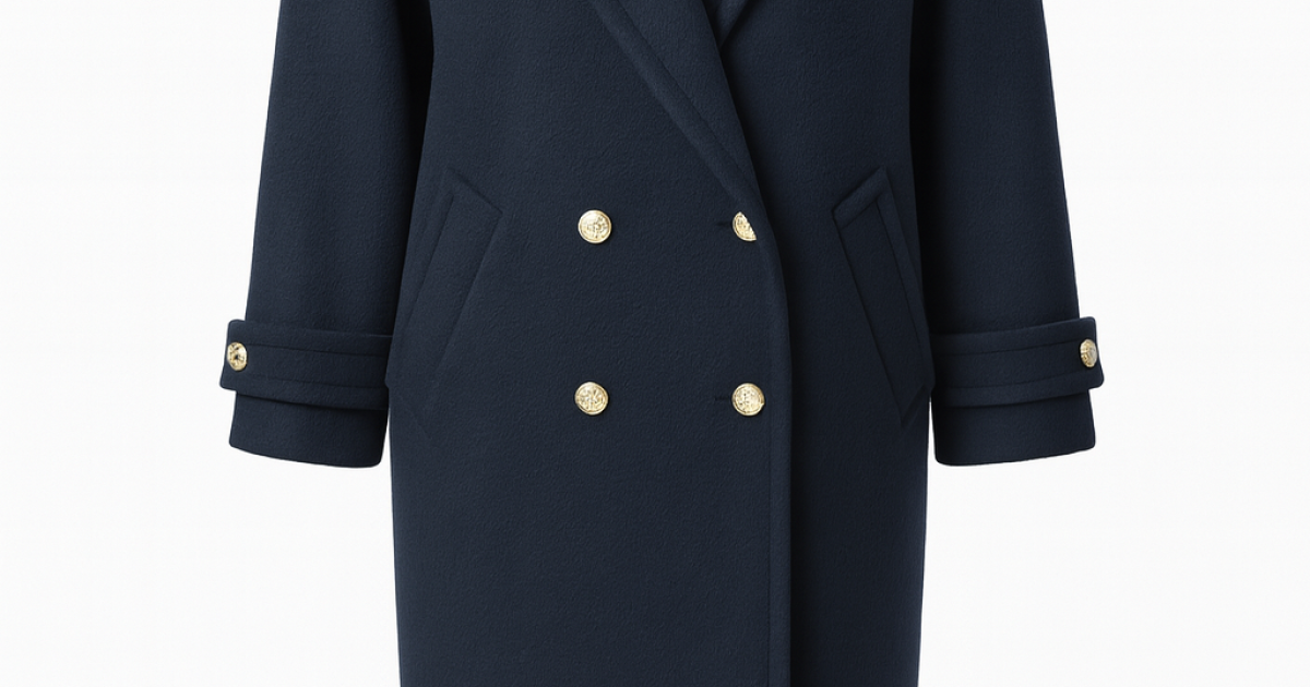 Elegantní dvouřadý kabát se spadlými rameny a klasickým anglickým límcem. Rukávy jsou zdobené detailem se zlatým knoflíkem. Všechny kovové doplňky jsou ve zlaté barvě. Součástí kabátu je pásek pro zvýraznění siluety. Na bocích se nacházejí dva šikmé kapsy a na zadní straně je rozparek. Kabát má nevyteplenou podšívku, což z něj činí ideální volbu pro přechodné období.