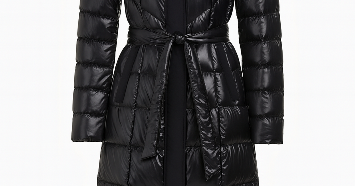 Dlouhý dámský péřový kabát z nepromokavé šusťákoviny v mírně rozšířeném střihu typu A. Přesné rameno, klasický dlouhý rukáv s pletenou manžetou, která chrání před větrem. Vysoký límec se zateplenou kapucí a stahovacími šňůrkami pro lepší ochranu proti profouknutí. Zapínání na zip a skryté druky, překryté légou z matné šusťákoviny. Součástí je pásek a dva boční šikmé kapsy na zip. Ve spodní části je obousměrný zip pro pohodlný krok. Podšívka je zateplená, z nepromokavého a neprofukavého materiálu.